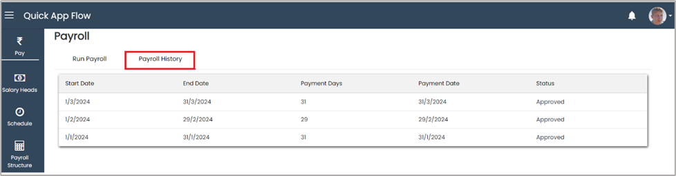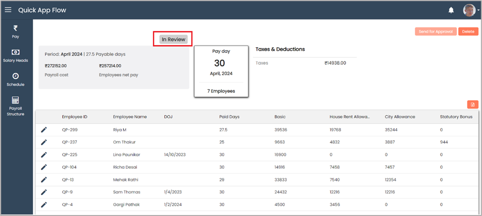 Once payroll send for approval its status change to ‘In Review’.