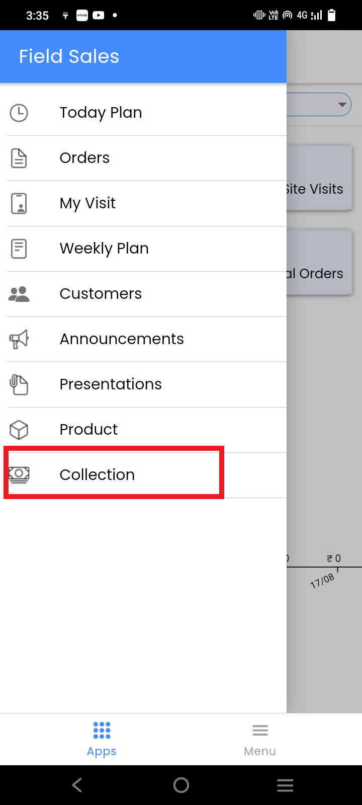 In collection menu user can collect the payment from customer, in a site visit