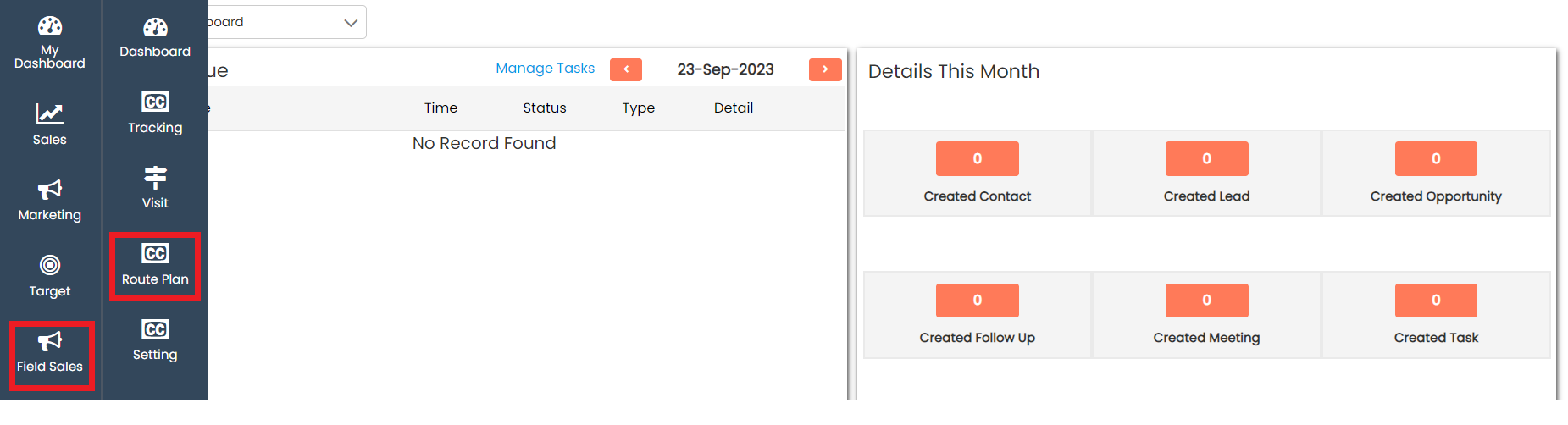 In CRM, to check the route plan of sales representatives, select Field Sales and click on Route Plan