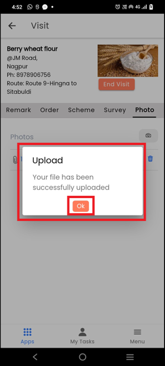 Capture the photo and a pop-up will show the message “Your file has been successfully uploaded.” Then click on **Ok**