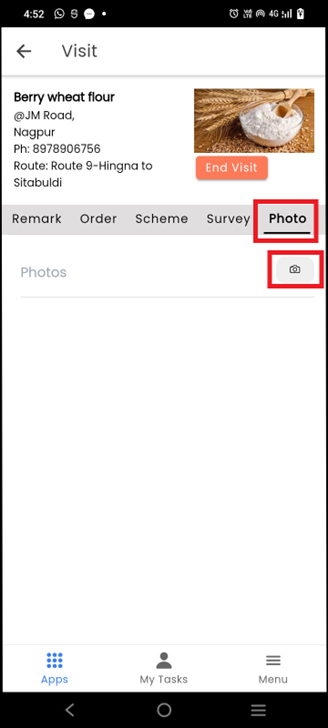 In the **Photo** tab click on the **Photo** **icon** to add site visit’s photo