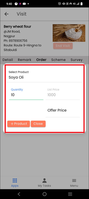 Select the product quantity. If you want to offer a discount on the list price then you can add it in the **Offer price** section. Fill in all the details and click on **+Product**