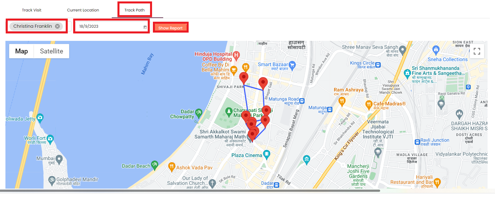 On the Tracking page, in **Track Visit,** select the **sales agent** and the **date** to check the exact location of the started and ended site visits.