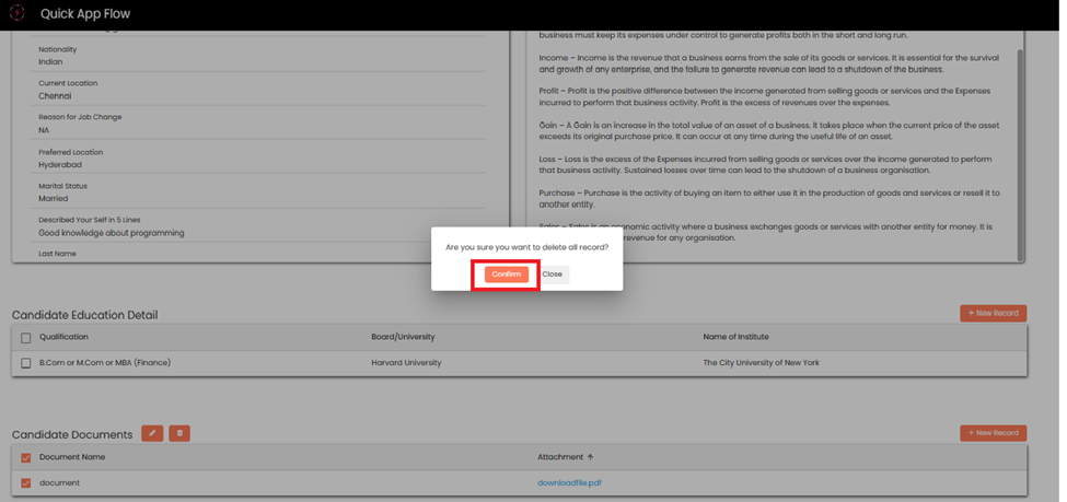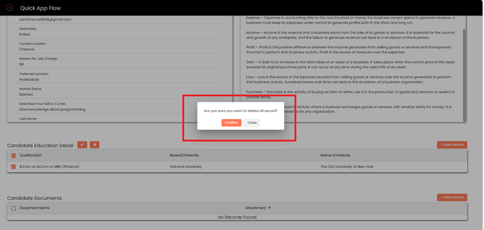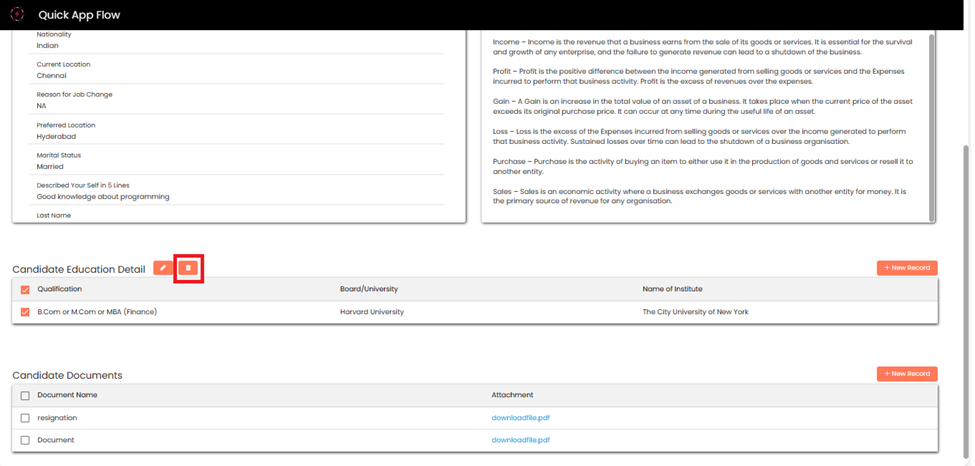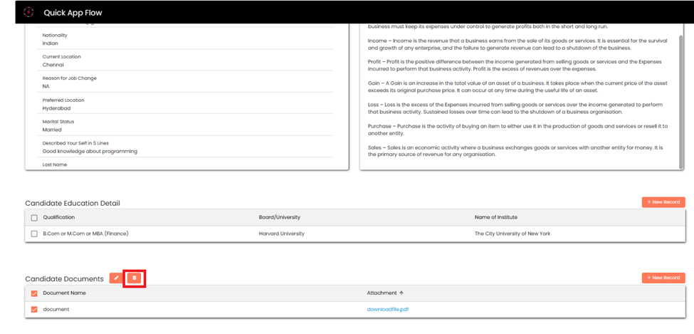 Candidate can the **delete** the record by clicking on **Delete** button.