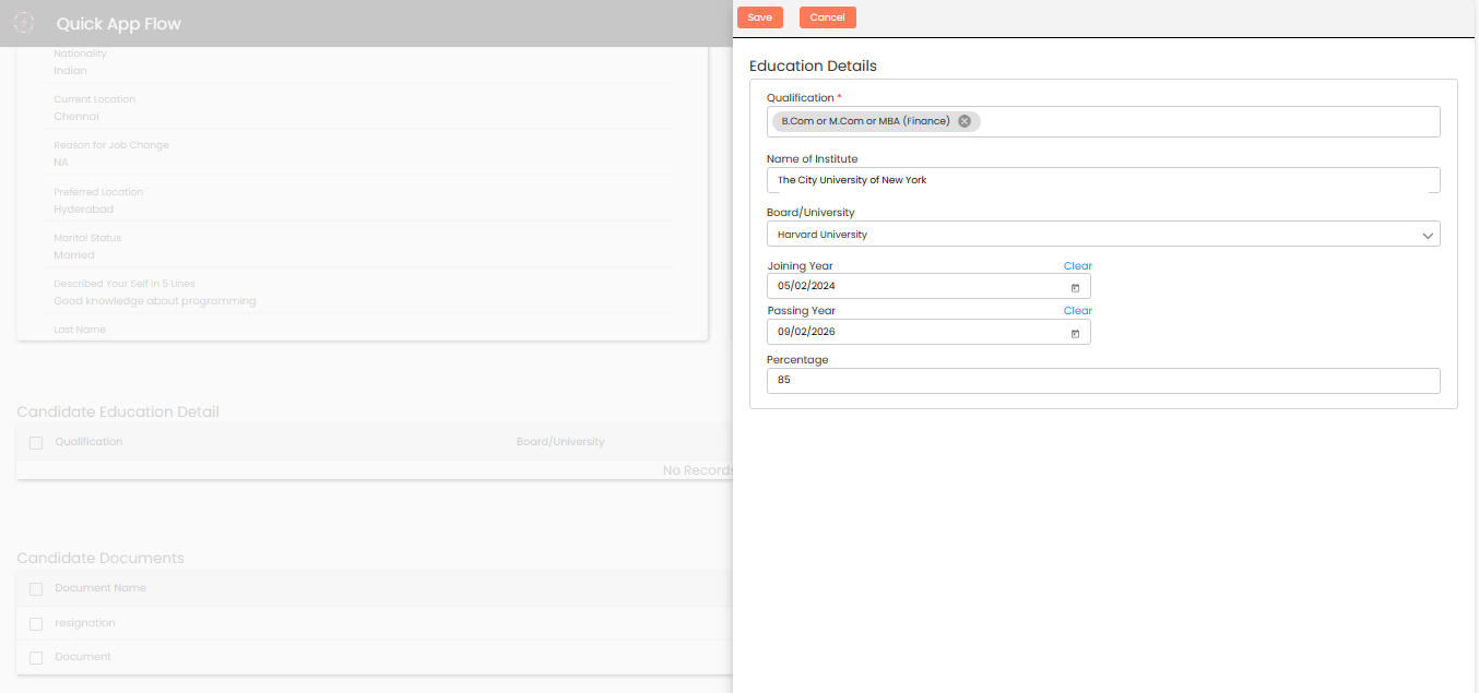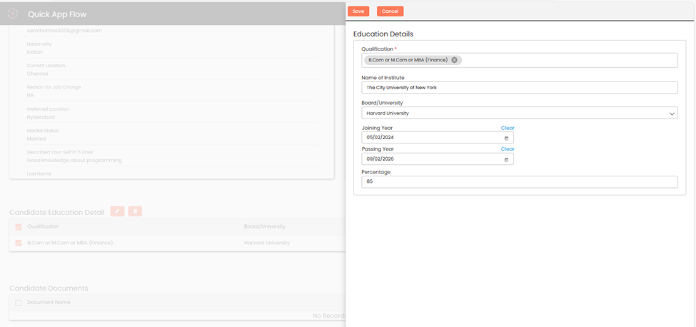 After clicking on +**New Record**, a popup will appear to fill the education detail&#x73;**.**
