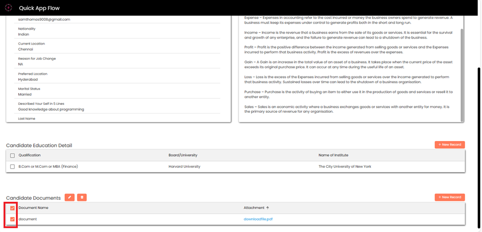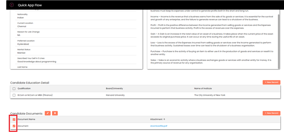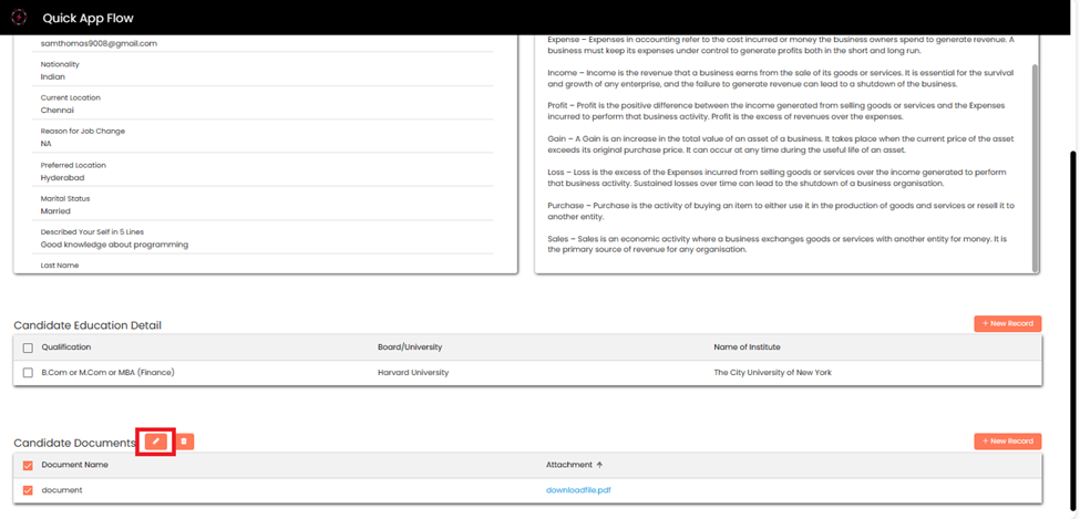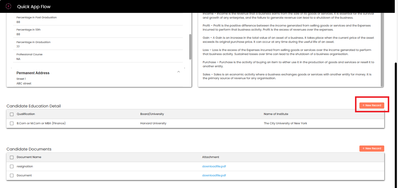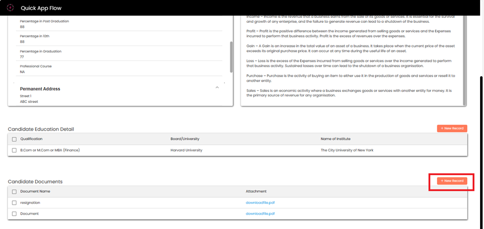 Candidate can **Scroll down** to add education details, by clicking on **+New Record.**