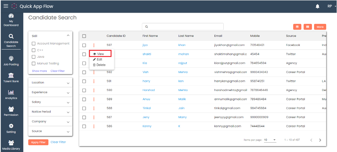 This will allow the recruiter to access options to view detailed information and the candidate's activity history.