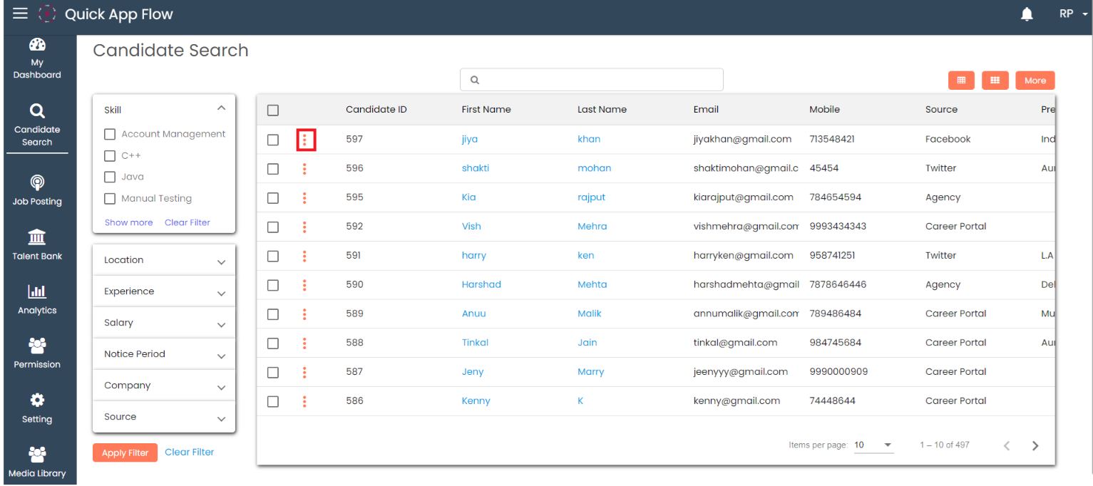 To view more details or the candidate's history, click on the three-dot menu (⋮) next to the candidate's name.