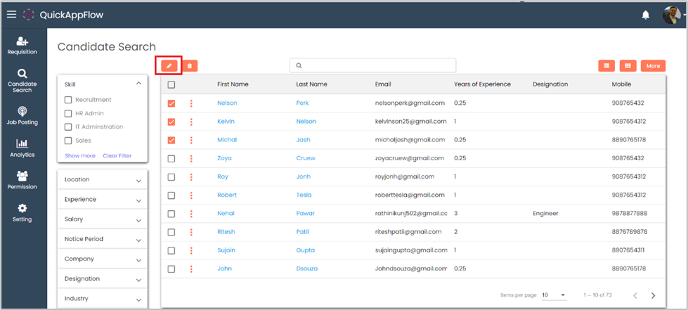 Recruiter can choose to bulk edit and delete candidates that you have created.