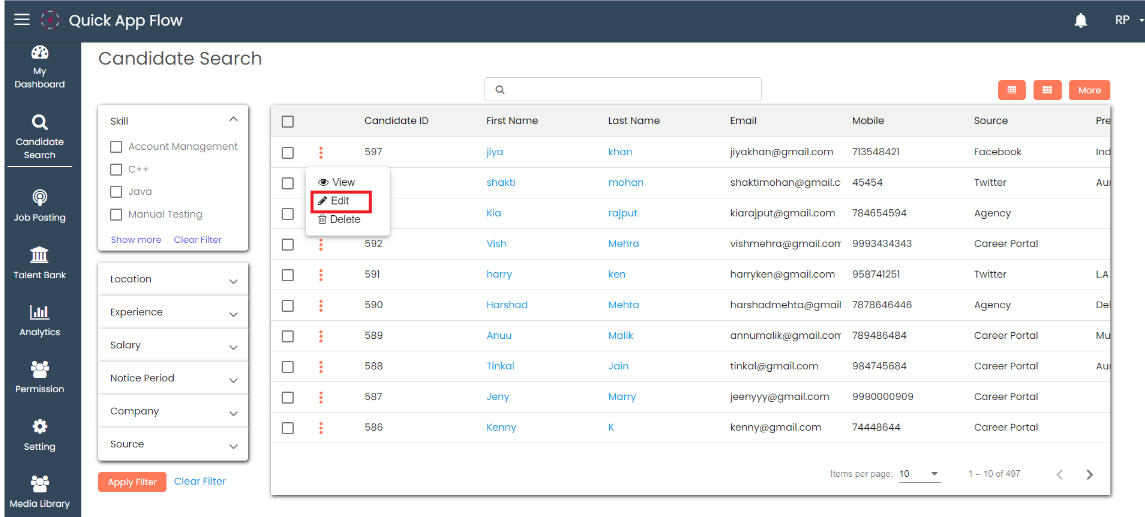 Once selected, the recruiter can perform actions such as Edit, Delete, Move, and other available actions from the action buttons.