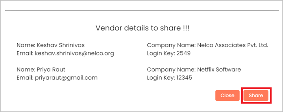 After clicking on Share, an email notification will be sent to the vendor with the login credentials.