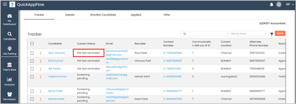 If the candidate does not submit the HW test, the recruiter can send a notification.