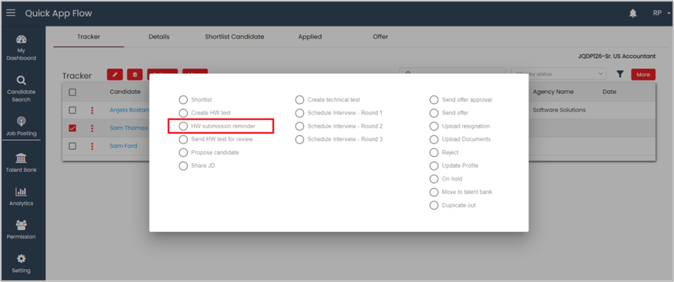 If the recruiter clicks '**yes**,' a reminder notification will be sent to the candidate, and an action-performed notification will be sent to the recruiter. The current status in the tracker will be updated to '**HW test reminded**,' and a task activity like '**Sent HW test reminder**' will be added to the history.&#x20;