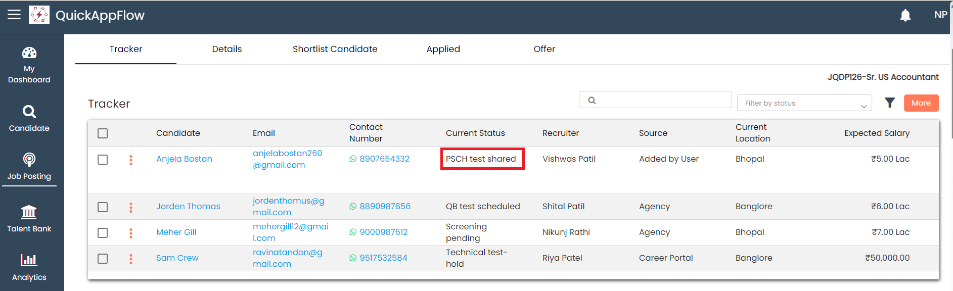After clicking on Yes, send an email notification to the candidate and update the current status to PSCH test shared in the tracker.