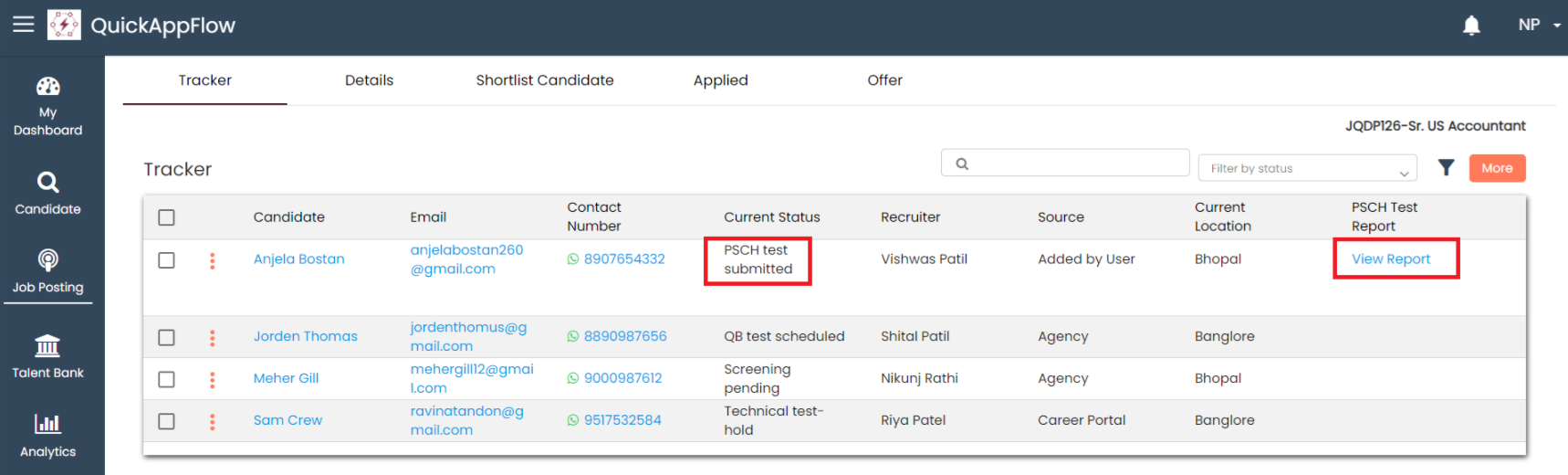 The candidate opens the link from the email and takes the test. After completing the test, the status changes to PSCH test submitted in the tracker, and the recruiter receives an email notification of the completed test. The recruiter can then download and view the test report.