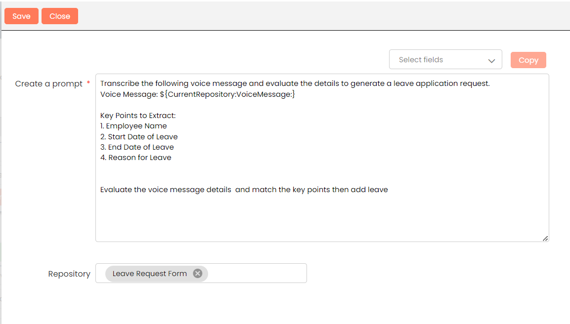 In the prompt creation screen, you will need to define the AI prompt. Write your prompt in the 'Create a prompt' text box, In the "Repository" field, select the repository in which you want to store the converted structured data, such as "Leave Request Form".
